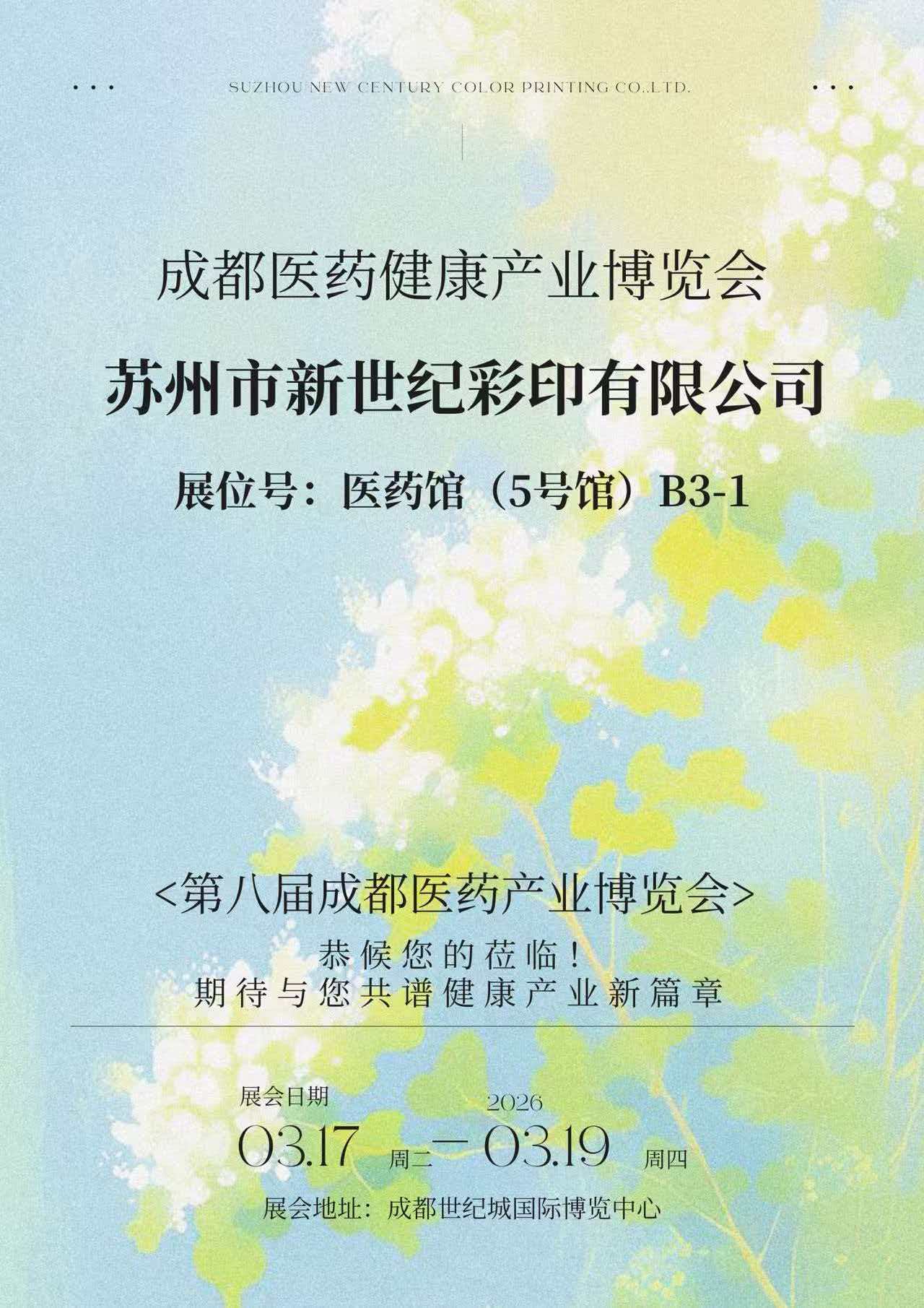 Fra 17. til 19. mars 2026 ble den åttende Chengdu Medical and Health Industry Expo avholdt på Chengdu Century City internasjonale konferanse- og utstillingssenter. Suzhou New Century Color Printing Co., Ltd. (heretter referert til som "New Century Printing") avduket sine siste prestasjoner innen farmasøytisk emballasje på stand B3-1 i Pharmaceutical Hall (Hall 5), og viser omfattende sin omfattende styrke innen utskrift av farmasøytisk emballasje, strukturell design og samsvarstjenester. Det tiltrakk seg en rekke farmasøytiske selskaper og bransjeeksperter for å stoppe og utveksle ideer.